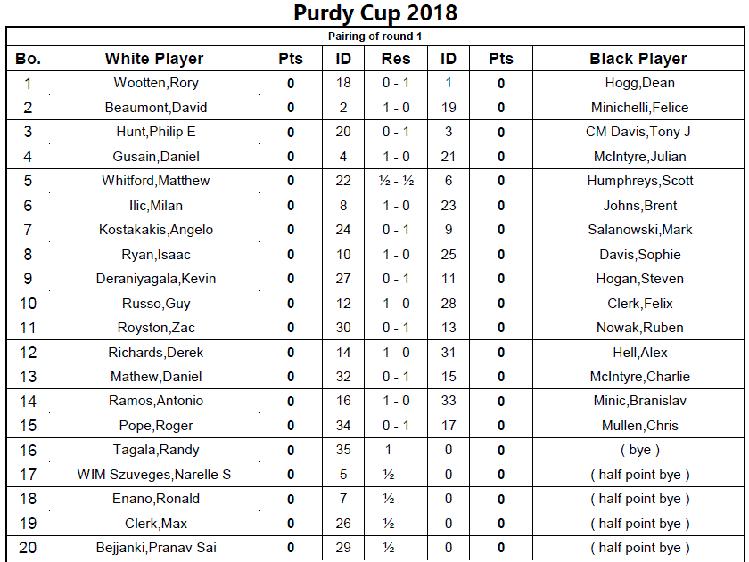 1 = Hogan,Steven ( 1.0) - Gusain,Daniel ( 1.0) = 10 - 1 = 0 - 1 ----------------------------------------------------------------------------------- 2 = Beaumont,David ( 1.0) - Nowak,Ruben ( 1.0) = 2 - 9 = 1 - 0 ----------------------------------------------------------------------------------- 3 = McIntyre,Julian ( 1.0) - Hibberd,Nathan ( 1.0) = 12 - 3 = 0 - 1 ----------------------------------------------------------------------------------- 4 = Davis,Tony J ( 1.0) - Richards,Derek ( 1.0) = 4 - 11 = 1 - 0 ----------------------------------------------------------------------------------- 5 = Saric,Sergey ( 1.0) - Enano,Ronald ( 1.0) = 14 - 5 = ½ - ½ ----------------------------------------------------------------------------------- 6 = Waadhwa,Ehsaas ( 1.0) - Humphreys,Scott ( 1.0) = 31 - 7 = 0 - 1 ----------------------------------------------------------------------------------- 7 = Salanowski,Mark ( 1.0) - Whitford,Matthew ( 1.0) = 8 - 13 = 0 - 1 ----------------------------------------------------------------------------------- 8 = Jing,Lang ( 0.5) - Clerk,Max ( 1.0) = 17 - 21 = 1 - 0 ----------------------------------------------------------------------------------- 9 = Cheema,Mohammad ( 0.0) - Nawar,Mena ( 0.5) = 6 - 24 = 1 - 0 ----------------------------------------------------------------------------------- 10 = Kurian,Maksym ( 0.0) - Hogg,Dean ( 0.0) = 22 - 32 = 0 - 1 ----------------------------------------------------------------------------------- 11 = Johns,Brent ( 0.0) - De Rooy,Jack ( 0.0) = 15 - 26 = 1 - 0 ----------------------------------------------------------------------------------- 12 = Watson,Nicolas ( 0.0) - Hibberd,Aaron ( 0.0) = 25 - 16 = 1F-0F ----------------------------------------------------------------------------------- 13 = Kostakakis,Angelo ( 0.0) - Dissanayake,Pehansa ( 0.0) = 18 - 28 = 1 - 0 ----------------------------------------------------------------------------------- 14 = De Rooy,Samuel ( 0.0) - Deraniyagala,Kevin ( 0.0) = 27 - 19 = 0 - 1 ----------------------------------------------------------------------------------- 15 = Clerk,Felix ( 0.0) - Rawat,Bijay ( 0.0) = 20 - 30 = 0F-0F ----------------------------------------------------------------------------------- 16 = Mcintyre,Cameron ( 0.0) - Bejjanki,Pranav Sai ( 0.0) = 29 - 23 = 1 - 0 ----------------------------------------------------------------------------------- 17 = Dastghi,Saam ( 0.0) - Lim,Neiss ( 0.0) = 35 - 34 = 0 - 1 ----------------------------------------------------------------------------------- 18 = Deng,Tina ( 0.0) - Dastghi,Karun ( 0.0) = 33 - 36 = 1 - 0
