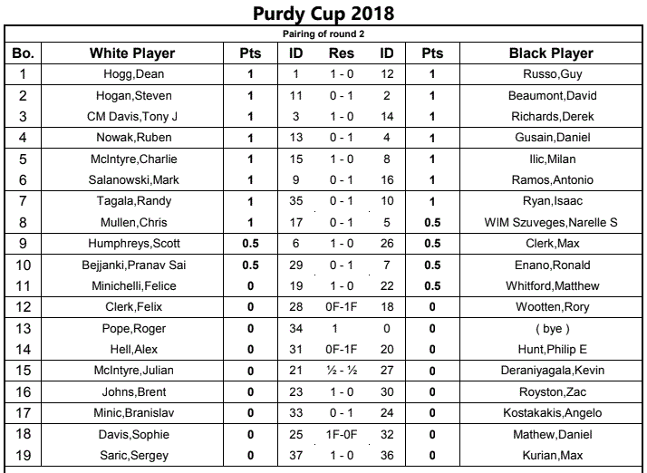 Round 2 of the Purdy Cup results are below, with a provisional round 3 draw. Sergey, Matthew and Cameron had results better than their rating. Tina also scored what I think is her first win!